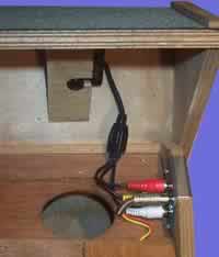 Last year we had a problem in that one of the tits started roosting in the area at the top of the box next to the camera. We presume she found it warm and cosy up there. A short while later she found the cables leading to the camera and started pecking at them. Fearing that they would get damaged, I inserted a small sheet of glass, preventing the bird's access to the top. The picture alongside shows the relevant parts of the tit box. The bird was getting up through the round hole in the plywood panel at the top of the box where the gap between the panel and the camera support with the box closed is about an inch.