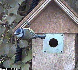 And this is why! Gelda has eventually woken up to the fact that the bluetits are still after her nest box and has come charging back to defend it.