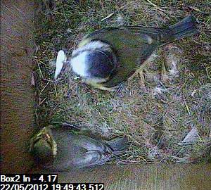Again, Mum comes back to the nest box and this time she has brought some food for the chick.