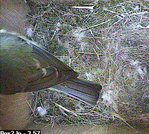 Finally it seems to be having an effect and the first bird starts to leave the nest box.