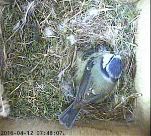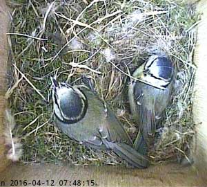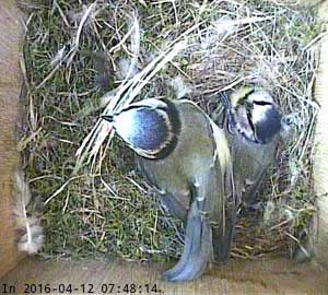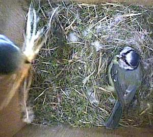 Suddenly, another bluetit appears at the entrance. She isn't made welcome by Spikey!