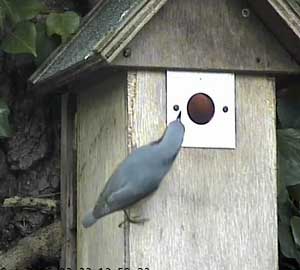 This nuthatch is clearly looking for a nesting place and is examining the entrance to Box2. The hole is much too small for it but it doesn't get a chance to investigate this.