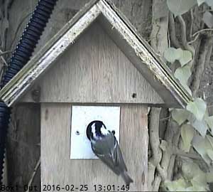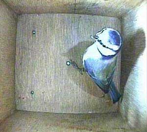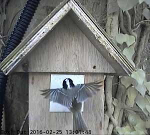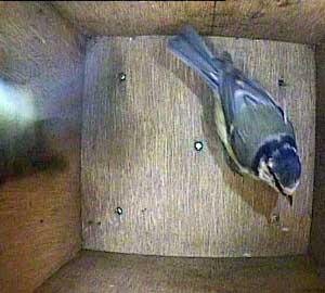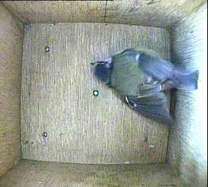 Having settled on the roof of the nest box, it had to do a somersault to get inside.