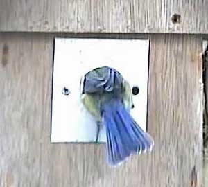 This is the start of another common sequence. The male bluetit as gone into the nest box ...