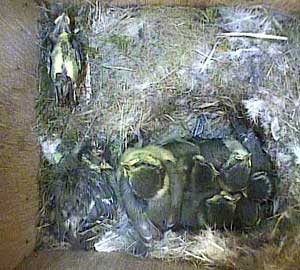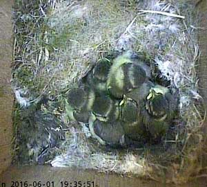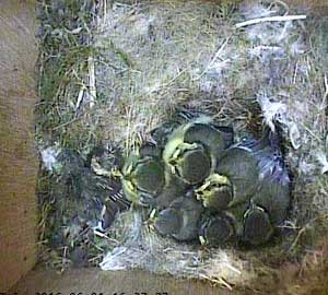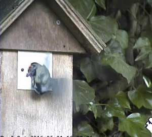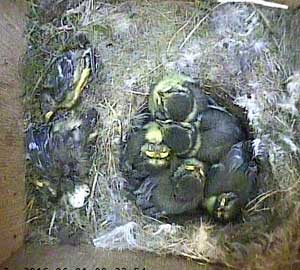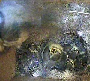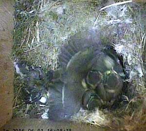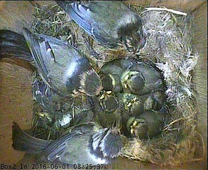 Once she has got it there, she leaves it and look set to leave the nest box! You may just be able to see its feet in the air at the top of the nest cup.