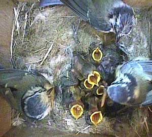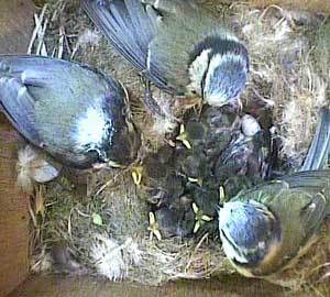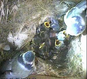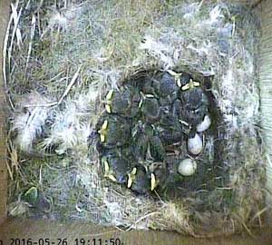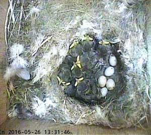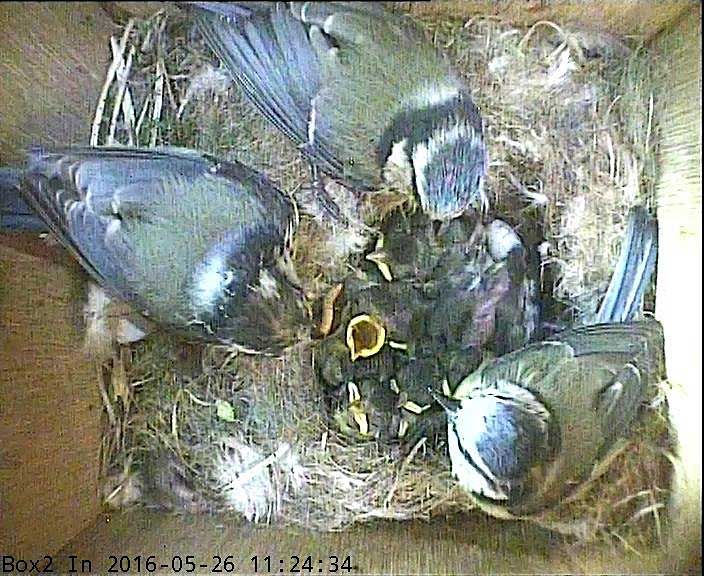 Again, all three parents are in the box at the same time. This time the chicks seem deliriously happy to see them. Perhaps they have not yet been fed?