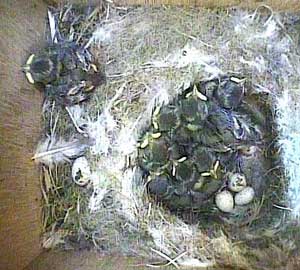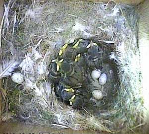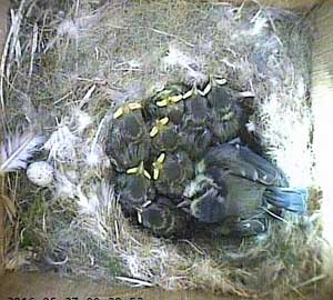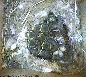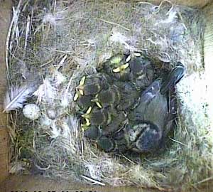 Eight chicks looking fairly relaxed, and all facing the entrance hole, with mum sitting awkwardly on the far side of the nest cup.