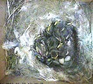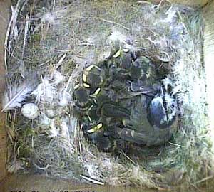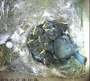 After all the excitement caused by Hugh's visit has died down, the wandering chick is still trying to walk through the side of the nest box - and obviously failing . . .