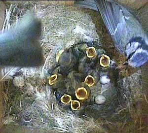 At least this display enables us to see how the chicks are developing. Feathering is growing up their wing pins and you can see here that their eyes are now open. Anyway, I presume that a chick wouldn't wander of its own accord if it couldn't see!