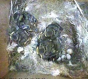 Another bird comes in with food, and all is revealed - she, and I think it is Spikey, was sitting on a couple of the unhatched eggs!