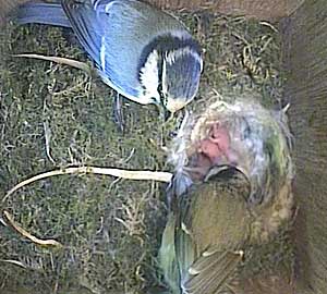 It's shortly before 9 o'clock and Max has brought some food for the chicks. At this stage, the food given to the chicks is nearly always a little green caterpillar. This is the larva of the Winter Moth which lives on oak trees at this time of year and which make excellent food for the chicks.