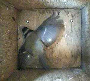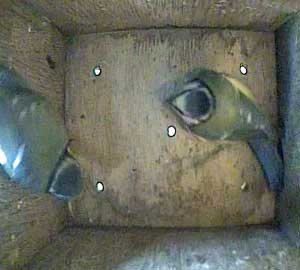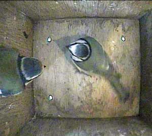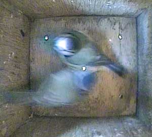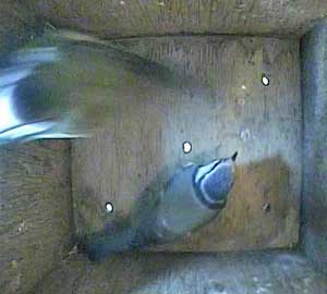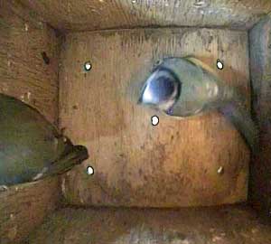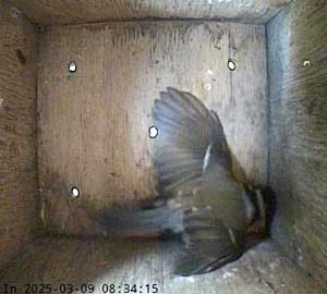 This time the female doesn't come to the floor of the box but swivels on the entrance hole and looks outside.
