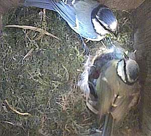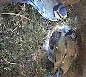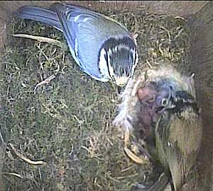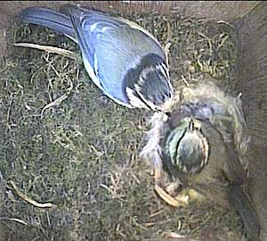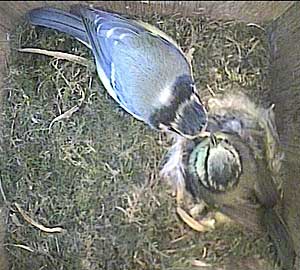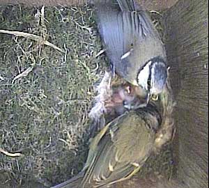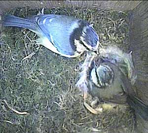 The process of selecting which chick to give food to appears quite complicated. Meg (like all female bluetits that I have watched) offers the food to one chick after another until she finds one that appears to be really eager for it. If that chick doesn't swallow the grub quickly, she will take is away again, even if it appears to be partially swallowed!