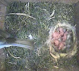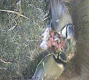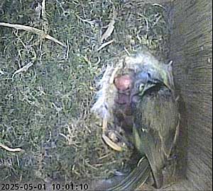 Sometimes Meg leaves the nest box, presumably in order to find food for herself. Here she is off. However, the chicks all appear well and can cope with her leaving them for short periods from time to time.