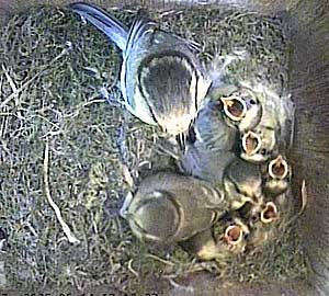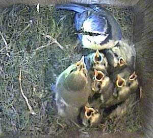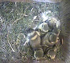 This looks like 8 chicks - but it can't be! So it must be both parents in the nest box!