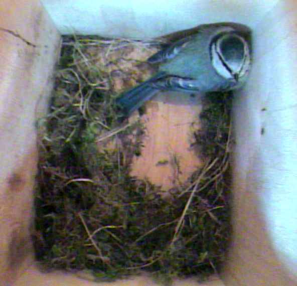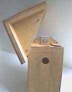 I recently ordered a new tit box with an in-built video camera from Boxwatch. We intend to use it to replace the tit box on the hornbeam at the bottom of our garden that has been occupied by bluetits each year for several years. The complete kit arrived this afternoon. It is very impressive; it is well-built using good quality materials and components. The first problem was how to get the cable from the video camera to the TV. Elizabeth and I discussed various alternatives but finally we decided that a hole through the wall was the best solution. I tested everything in the sitting room first to make sure it all worked before installing the box outside. The picture on the left shows how the lid of the box, which contains the camera, opens.