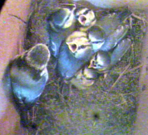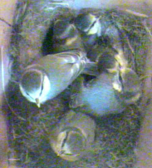 Our birds are still with us, and getting more and more active. A lot of time is spent on preening, with occasional bouts of violent wing flapping. We are providing good supplies of mealworms, and the hen runs a regular shuttle service after the feeder has been topped up. After we have topped up the supply via a funnel held in an entry port, we bang with the spoon on the arm of the wooden chair beneath, and we think the hen now recognises this welcome sound. The faecal sacs are still being removed regularly - the birds always wait a couple of seconds after delivering food, to see if there is a faecal sack to be removed. On one occasion today, after the cock had fed a chick and removed its sac, the hen arrived and fed another chick in her turn. However she was confused by the stance of the first chick and she pushed her head under its tail as if to ensure she had not missed anything. When a chick has something to deliver, it arches in a tremendous back bend to make it easy for the parent bird to collect and it takes some time to revert to its normal posture.