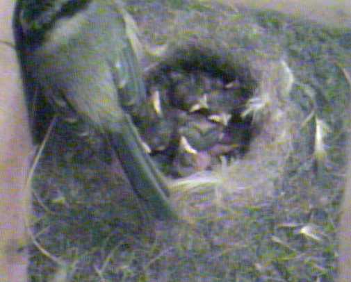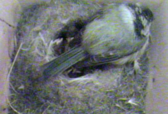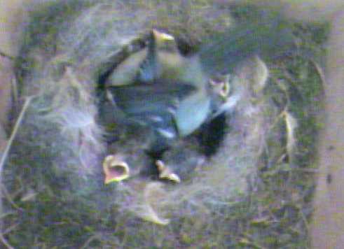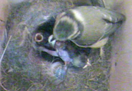 The chicks are visibly growing every day. This morning we were struck by how much darker they had become as a result of their early growth of feathers. They are also becoming much more noisy, greeting each parent with a clamorous high pitched cheeping. Presented with so many gaping mouths, the parent pops its item of food into any available mouth, and if it is not swallowed immediately, promptly removes it again to give to another chick This may happen several times before it is taken quickly enough to satisfy the parent bird.