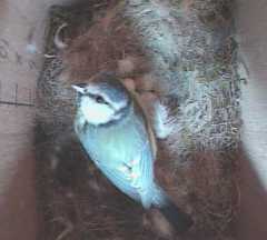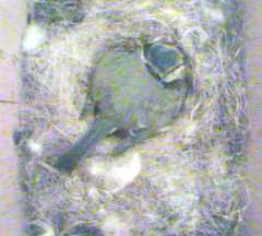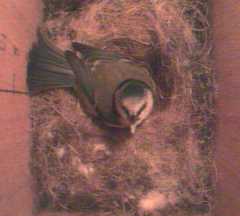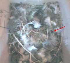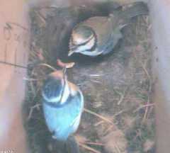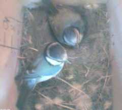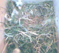 Bird1 has discovered the supply of nesting materials, and has taken several small bits into the box.