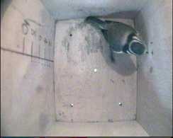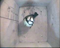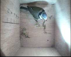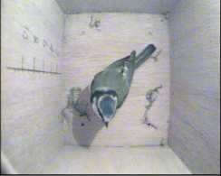 Elizabeth reckoned that a bird would soon go into the box. It did, and we watched several visits on the TV. Almost the first time it went into the box, it tried to get up to where the camera is. It managed to peck at the lens once, but it normally could get a grip on anything to stay there. Its behaviour is just the same as last year's bird, and we are wondering if it could be the same one. (See the diary for March 2001 to read about our problems with the bird attacking the camera). We have the TV sound turned on, and we can recognise that familiar noise as a bird lands on the entrance to the box, and goes in.