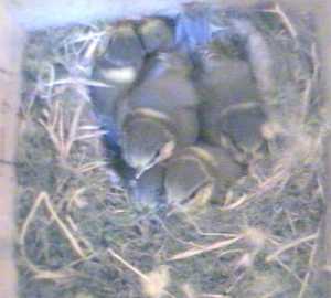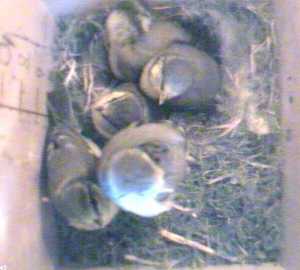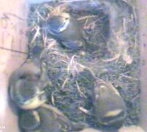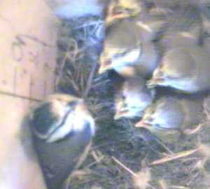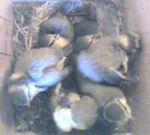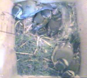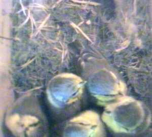 This is the day we think could be departure day. I put a timer switch on the camera, and set the video recorder, in case they did a dawn break, but they are still with us at noon. The birds are very restless, with lots of preening activity and occasional bouts of violent wing flapping. It's a beautiful day - quite breezy, but with a clear blue sky and bright sunshine - just right for a maiden flight (apart from the fact that 2 magpies have been seen in the garden on several occasions). One chick actually hopped up to the hole, staying there for a few seconds, before scuttling back, and retreating firmly into the nest cup, apparently overcome by his daring. Another chick picked a small piece of dried moss from the nest, and held it in its beak for a while - a comfort blanket?