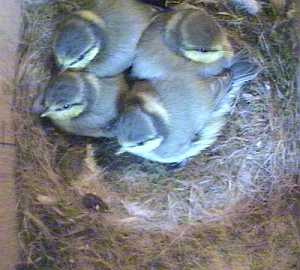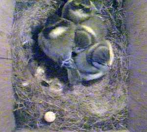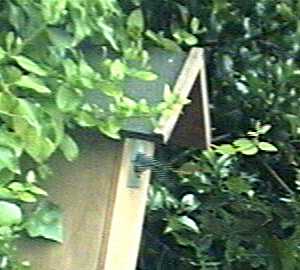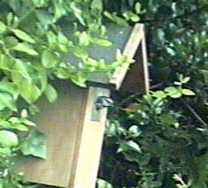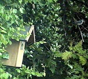 Although we were expecting it, the departure of the first of Battler's chicks at about 9.20am today caught us by surprise. We had the VCR on but were running the webcam so we do not have a computer record of its going. Looking at the tape, it was working itself up to it for a little while before hand. As well as hopping up and down, looking out of the hole and flapping its wings a lot, shortly before it went it hopped up onto the nest box hole several times and looked out for a while before retreating back inside. Suddenly it was gone without our noticing at the time.