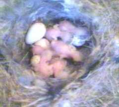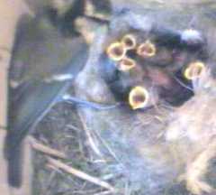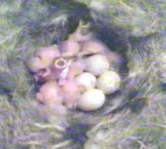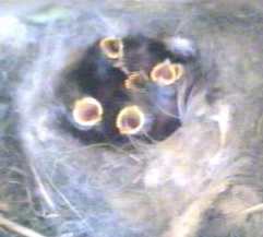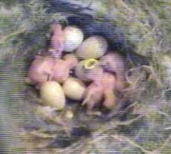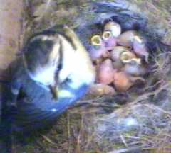 This is Victor with his (or perhaps not all his?) chicks. Scrap is the one in the middle at the top. His gape is half the size of that of the other chicks!