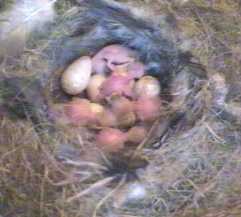 Beauty's 7 chicks in Box1 continue to develop. On the left you can just make out six open beaks - and one closed one!
