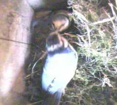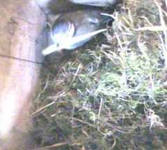 This is where Fantail seems bent on wrecking her nest. It seems there is a big bit of hay in it that she doesn't like. You can't really see her in the first image, but she is there - buried under the moss and hay. She grabs the hay stalk and makes for the exit - nearly dragging the whole nest with her!