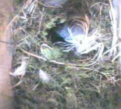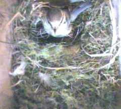 Fluffy was very busy with her nest this morning. In 1hr 50min she brought material into the nest 14 times out of a total of 17 visits. You will see that by the end of the day her nest looks very cosy indeed.
