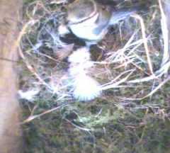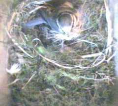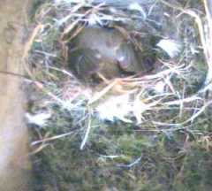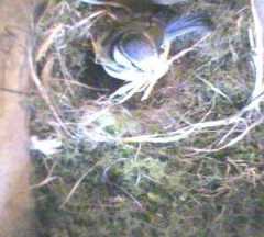 Now that the nest is nearly complete, you can see the reason for the nesting wriggles we keep referring to. This is the movement she makes to form the nest cup when the nest is full of moss, hay - and string!