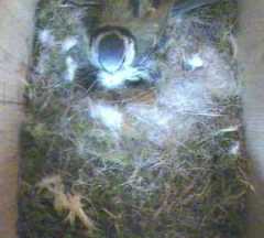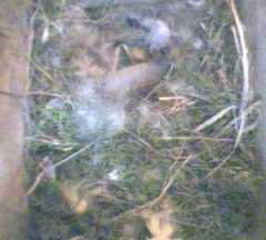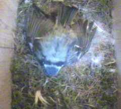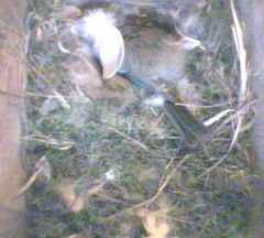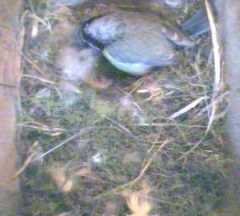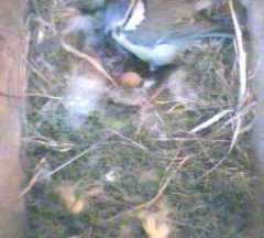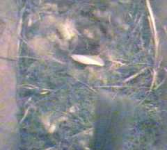 If you know where to look, just above the large white feather in the left hand image, you can see a cream coloured spot. Having seen eggs under this camera in previous years we recognise the colour, different from a bluetit's egg colour in daylight. Could it be an egg after all?