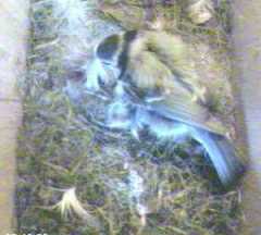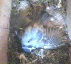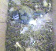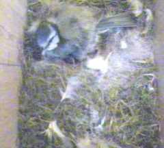 After all this, she flew out of the nest, only to return shortly after with another feather. Where does she find them all? She continued her frequent visits to the nest, fiddling around with the feathers. On one occasion Elizabeth noticed on the TV screen that Fluffy was perched quietly on the entrance hole looking out, but remaining quite still for some seconds. I went upstairs to watch from the landing window, and saw that she had a large feather in her beak. She then took this into the nearby oak tree, and seemed to be pecking at it (was she airing the bedding?) before taking it back into the box. Shortly afterwards she took it out again, and went into the hornbeam a few yards away. She then dropped it, apparently accidentally, and seemed to lose interest in it.