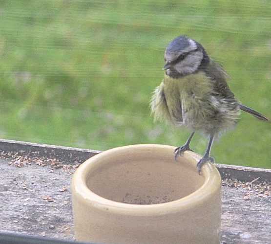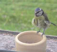 While we are showing some normal digital photos as opposed to video pictures, here is one of Fluffy in all her glory. The bowl is the one we used to use to feed her and other birds with mealworms. (The lines visible on the larger version are due to the fact that it was taken through our dining room window!)