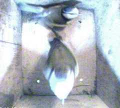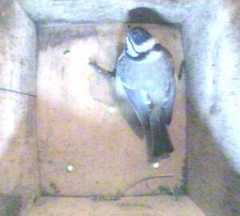There is a shelf outside our dining room window which we use to feed mealworms to our robins. This morning I was casually looking at it when a very scruffy bluetit came to investigate. I suddenly realised that this was Fluffy. She looked even worse in the flesh than through the video camera. Unfortunately, she flew away before I could get my camera. We shall have to keep a watch out for her in future.