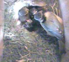 Fantail is under the chicks left wing! Scrap is finding it difficult to swallow a large mealworm.