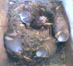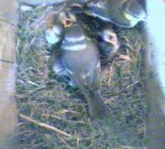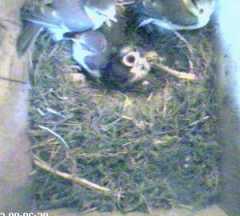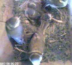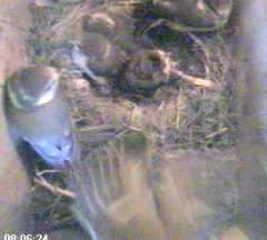 Suddenly, at about five past eight, it starts getting serious. First one, and then another chick moves forward and looks up at the exit hole. You sense the "Shall I go?" question in the air. When one chick gets particularly bold, but then its courage fails it, it runs back to the nest cup and huddles against the others. On the left below, the chick at the back had almost left the nest - but not quite. The picture on the right is the last where all six chicks can still be seen.