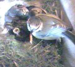 You can just see the end of a mealworm in Scrap's beak. That's not good enough for Fantail who grabs it and flies out with it.