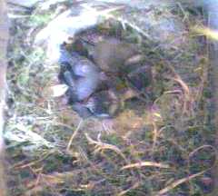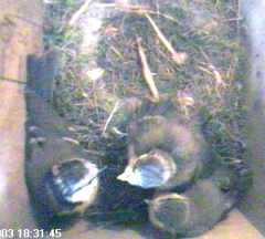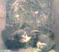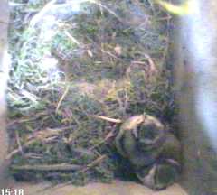 Recently, the two chicks left have taken to cuddling up together next to the front wall of the box - a dangerous position if the woodpecker returns. Now, though, they return to the nest cup for a snooze.