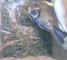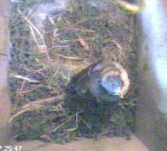 (Scrap sits in the hole for a long time, sometimes flapping his wings, sometimes looking behind him back into the nest. At last we get a glimpse of his tail disappearing and the pattern of light in the box changes telling us that the last chick has flown the nest.)