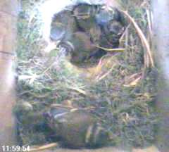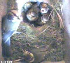 Scrap stretches his wings. On the right, Dad watches while Mum feeds a chick.
