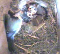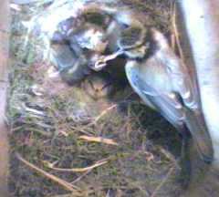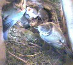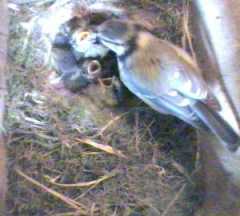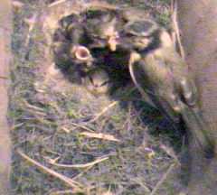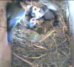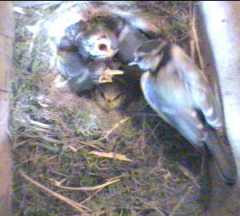 Both parents have the habit of appearing to tease the chicks with food. We suppose that this is to ensure that only the hungriest chicks get fed. This time Fred goes too far. He comes in with a mealworm shortly after 8 o'clock.