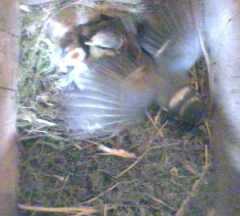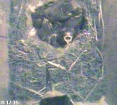 Watching the images, this looks as though the chicks have heard a warning from their parents. Their response, including Scrap's is to huddle down low. Nothing entered the nest though the pattern of sunlight flickered irregularly - something was definitely outside the nest.