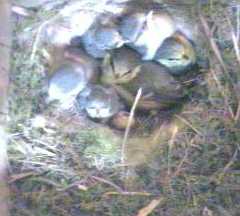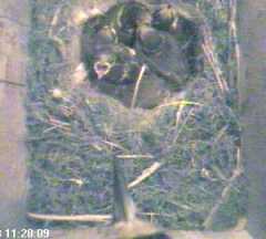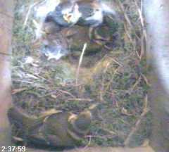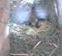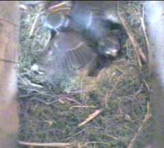 One of the older chicks goes walkabout - as we saw with Fluffy's chicks, all the chicks are vulnerable to an attack from a woodpecker, so we just have to hope none comes around when one is out of the nest like this.