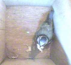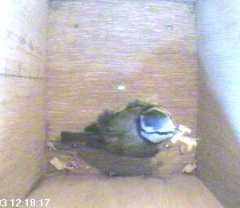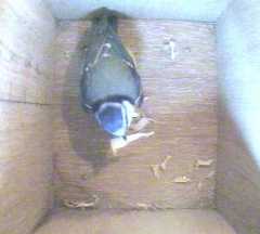 I was in the sitting room watching Box2 on the TV when I noticed that Fluffy had flown up to the top of the box and was pecking at something there. Suddenly, she gave a wriggle and disappeared from view! In spite of the collar, in the form of a cardboard tube that we added last year to solve this problem, she must have managed to find a way up into the attic.