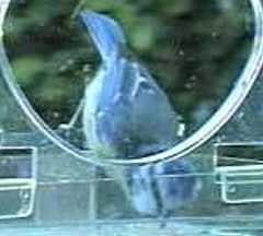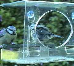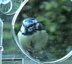 Yesterday, we pictured a bluetit on the mealworm feeder with a funny face - the black and white areas on its face appear to be mixed up, mainly on its left hand (wing?) side. We now think that this may be Flash as he and Fluffy have been seen together on the feeder and appear quite comfortable in each others presence. We show a close up of the bird below.
