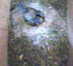 We always used to think that a bird's brood patch would be beneath the front of her body. Here you can see that it is the area beneath her tail where Fluffy has lost her feathers. This has been evident with previous bluetits that we have watched.
