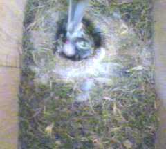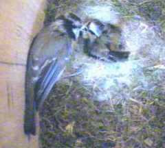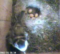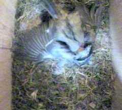 Fluffy nearly buried in the nest cup. She appears to be much more restless than Fantail. Here she has got off the nest to look outside, but after a short while she returns to her maternal duties without leaving the nest.