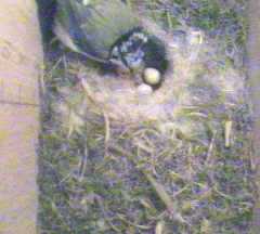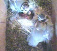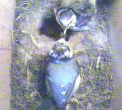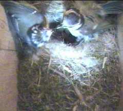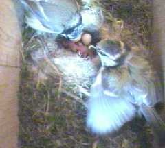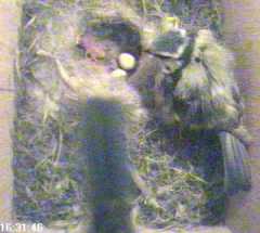 Another strange incident occurred - now we wonder if it is he who wants to feed the chicks directly himself. He came in with an offering, but Fluffy remained firmly in the nest. When she tried to take the food from him, he wouldn't let go, although after a few tries he submitted, and passed it over, then quickly left the nest - at this point Fluffy moved out and fed a chick. Shortly afterwards, she was delving down in the nest, and emerged with a small white thing in her beak, which she proceeded to swallow. This could have been a faecal sac, and eating them is quite usual in the early days.