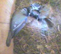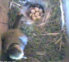 Most times, Flash passes his food offering to Fluffy quite happily. Sometimes, however, he has other ideas and refuses to relinquish it, forcing Fluffy to get out of the way so that he can feed the chicks himself. We cannot remember seeing this behaviour before. At the start of this sequence, Fluffy is sitting on the chicks when Flash enters.